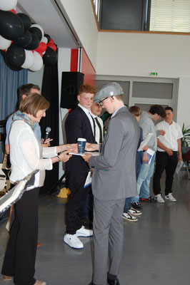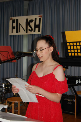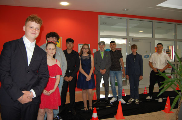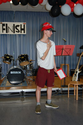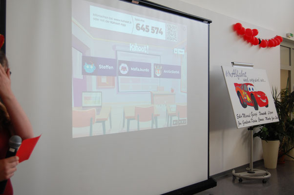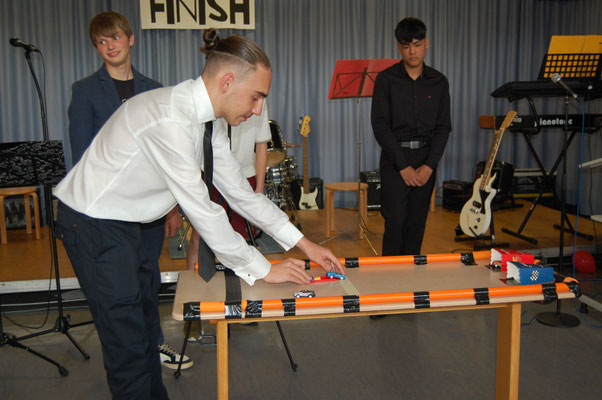 Natürlich wurden auch an diesem Abend die Abgängerinnen und Abgänger ebenfalls in die Gestaltung des Abends mit eingebunden. So mussten sie mit verschiedenen fahrbaren Untersätzen ein Rennen absolvieren, mit den Besuchern der Abschlussfeier Tabu spielen oder kleine „Cars“ fachgerecht steuern. Aber auch mit Worten sparten die Schülerinnen und Schüler nicht. So bedankte sich Domenik Fuchs als Abgänger aber auch gleichzeitig langjähriger Schulsprecher bei allen Lehrkräften stellte der Schulzeit insgesamt eine gute Note aus. Ebenso Mandy Jolie Renner, die eine sehr persönliche Rede hielt. Ein Kahoot-Quiz mit Parodien der Lehrkräfte und der Abgängerinnen und Abgänger animierte viele der Anwesenden zum Mitmachen und sorgte für so manchen Lacher. Auch die Schulband unter Leitung von Herrn Möller war wieder Teil des Programms und spielte drei Lieder, die zur guten Stimmung des Abends beitrugen.