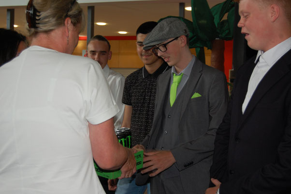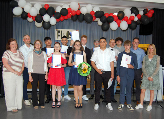 Die 22 Abgängerinnen und Abgänger aus den Jahrgangsstufen 9 und 10 starten in das Abenteuer "Leben" nun gut gerüstet. Das in der Schule Gelernte und Erlebte wird dabei ebenso helfen wie die erworbenen Zeugnisse, die als Höhepunkt des Abends an die Abgängerinnen und Abgänger ausgegeben wurden. 18 von ihnen erwarben den Berufsorientierten Abschluss und einige von diesen Abgängerinnen und Abgängern beginnen schon bald mit ihrer Ausbildung. Sechs Schülerinnen und Schüler der Kooperationsklasse mit der Hans-Viessmann-Schule nahmen an den zentralen Abschlussprüfungen zum Hauptschulabschluss teil und erwarben den Hauptschulabschluss. Die Zeugnisse wurden von Frau Anjelski, verantwortlich für den Bildungsgang "Berufsfachschule zum Übergang in Ausbildung" (BÜA) an der Hans-Viessmann-Schule, überreicht.