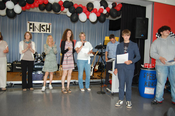 Frau Wörn als Elternbeiratsvorsitzende rief den Zuhörerinnen und Zuhörern in Rede in Erinnerung, dass so mancher Umweg und Boxenstopp nötig waren und trotzdem mit Hilfe der Boxencrew, bestehend aus Eltern und Lehrkräften, das jeweilige Ziel erreicht wurde. Frau Möller und Frau Ludwig forderten die Schülerinnen und Schüler im Namen des Vorstandes des Fördervereins auf auch im nächsten Rennen fokussiert zu bleiben. Herr Schneider ging stellvertretend für die Lehrkräfte der Friedrich-Trost-Schule insbesondere auf die Gefühlslagen der Schülerinnen und Schüler ein, nachdem die Zielflaggen, in diesem Fall die Noten der Hauptschulabschlussprüfung beziehungsweise die der Abschlusspräsentationen, geschwenkt waren.