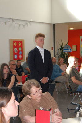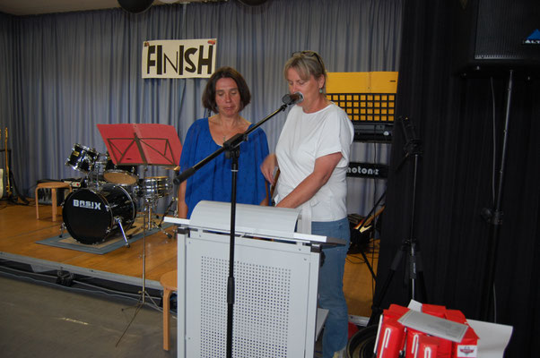Von einem Regenschauer unter das große Vordach geflüchtet, eröffnete Elke Mitze als stellvertretende Schulleitern die Feier mit einer Vorstellung der Abgängerinnen und Abgänger. Dabei beschrieb sie die Jugendlichen mit für diese besonders kennzeichnenden Merkmalen, die von den anwesenden Gästen erraten werden mussten.