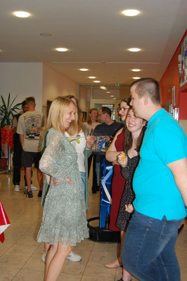 Nachdem die Abgängerinnen und Abgänger stilecht in das schön dekorierte "Stadion" eingelaufen waren, stand das erste Spiel für alle an: Reise nach Berlin, dem noch einige weitere wie Hochhalten, Dosenschießen und Pustefußball im Lauf des Abends folgen sollten.